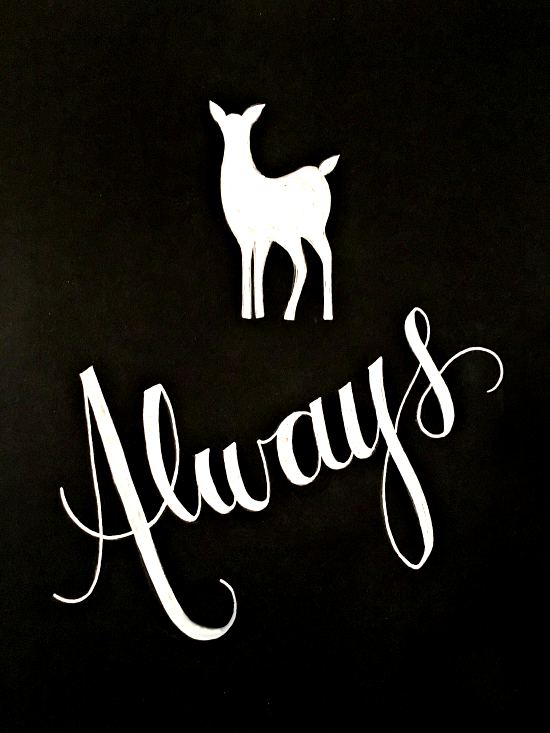 Step One: Using your charcoal pencil (or chalk), sketch an outline of a doe at the top of your paper and the word “Always” in cursive beneath. (I have included a PDF template if you’d rather use it.)