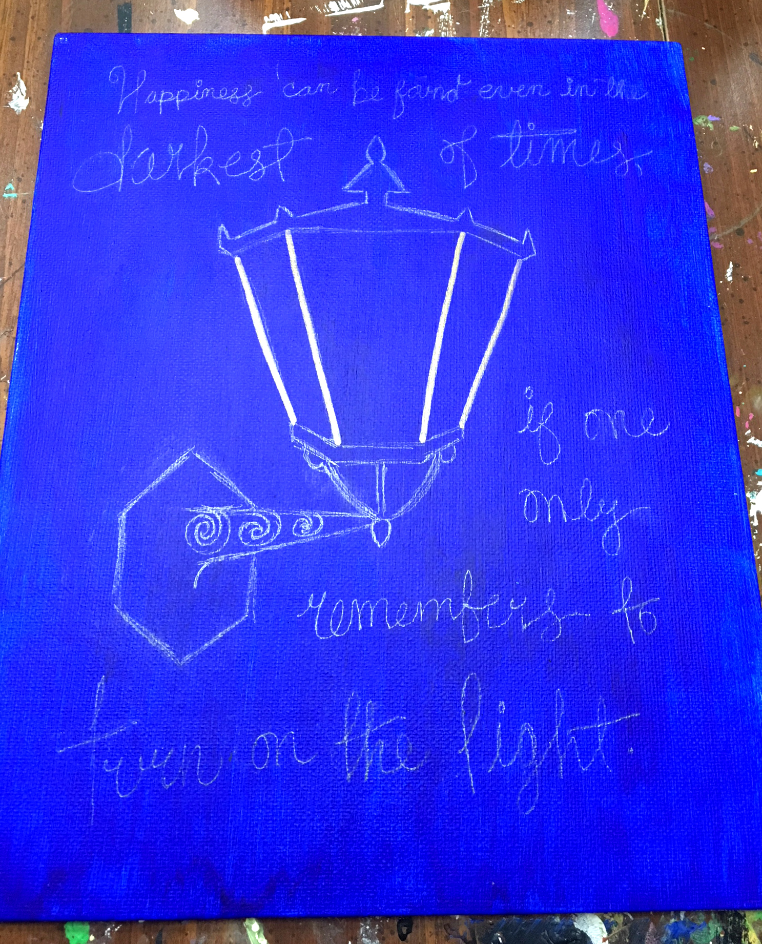 Step 3: Add the quote! I wrote mine out with a pencil in cursive, but if you want you could just as easily type and print it out from a Word document, then use Mod Podge to glue it down. The quote we are using is from Professor Dumbledore in Prisoner of Azkaban: